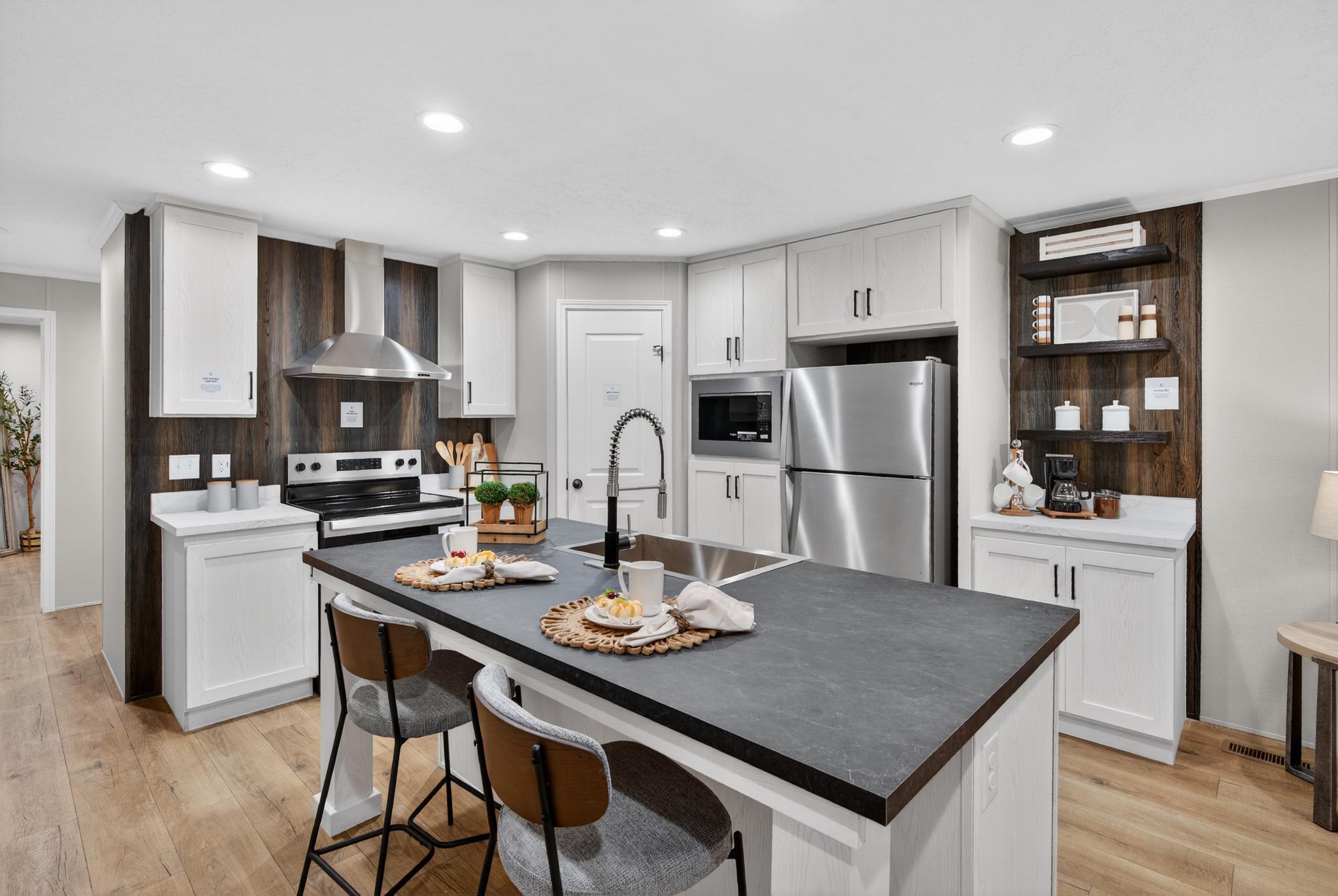 Kitchen Cabinetry: 30” O/H Cabinets w / Fixed Shelf / Wrapped Shaker Cabinets / Wrapped Cabinet Stiles / Shelf Over Refrigerator